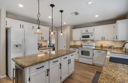 - Fully Equipped Kitchen: The modern, fully stocked kitchen with a custom island allows you to prepare meals for large groups, keeping everyone well-fed and happy during your wedding celebrations.