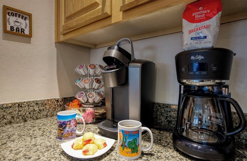 Keurig Coffee Maker, 12-cup coffee maker, electric teapot, Margaritaville drink blender, juice blender, toaster, cookware, tableware, spices, cooking oils, and everything you need to prepare delicious meals. For coffee and tea lovers, we provide a variety of K-Cups, ground coffee, teas, sugar, and creamers.