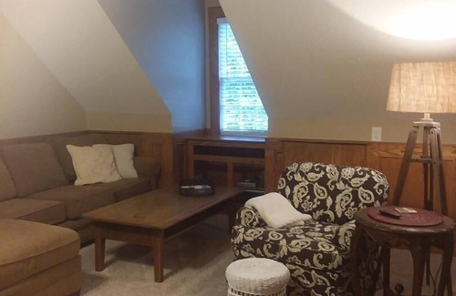 Homey space with all the comforts of home ...quiet, heavily treed neighborhood. The garage apartment is a fully self contained enclave. Central heating/air conditioning on own thermostat. LARGE desk area with surge protection and high speed internet. 55" big screen TV with mega cable and Firestick. Separate office room has small desk and single bed with comfortable chair. Guest may use grill and 'apt' deck. Kitchenette has sink, micro, refrigerator, toaster.