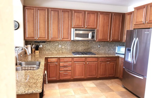And when the sun sets, you'll experience the magical quiet and peaceful ambiance of our surroundings with a night sky perfect for stargazing. Within a short drive, you'll find an array of dining options, shopping destinations, grocery stores, sports, and entertainment. Additionally, we offer complimentary WiFi, and there are televisions in both the living room and the upstairs bedroom. Lastly, the back patio on the main level features a covered BBQ area, a charming lemon tree, and comfortable seating for four, where you can observe daily golfers and the diverse desert wildlife. Please note that the quails in the lemon tree prefer quietude during the night and should not be disturbed.