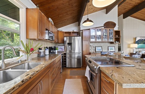 From the moment that you walk through the cozy wooden gates, you can settle into the pleasantries of your Hawai’i vacation home at Pali Kai. Nestled into the quiet side streets off of the Kamehameha Highway in the small town of Ka’a’awa on the North coast of Oahu, you’ll feel fully integrated into the neighborhood at this humble and snug abode, perfect for a sweet family vacation. Pali Kai is a modest 2 bedroom, 1 bath, that sleeps up to 4 guests. While it invites a small town charm, it also welcomes adventure and unmatched natural beauty stretching in every direction. Pali Kai is situated within walking distance from the crystal clear beaches of Oahu’s north shore, and it also offers views of the spectacular Ko'olau Mountain range that run through the center of the island. The outside garden is adorned in finely manicured tropical flora to brighten up any day spent lounging out on the large outdoor lanai.