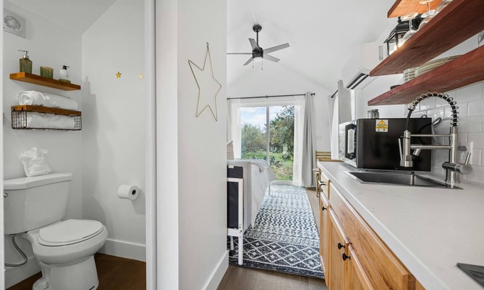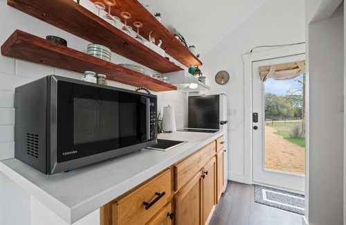 Queen bed, TV, cozy bath w/shower,and kitchenettew/ rustic charm, modern comforts, & an on-site steward, Amy,North Star Nook offers a seamless escape to the beauty of the Hill Country.