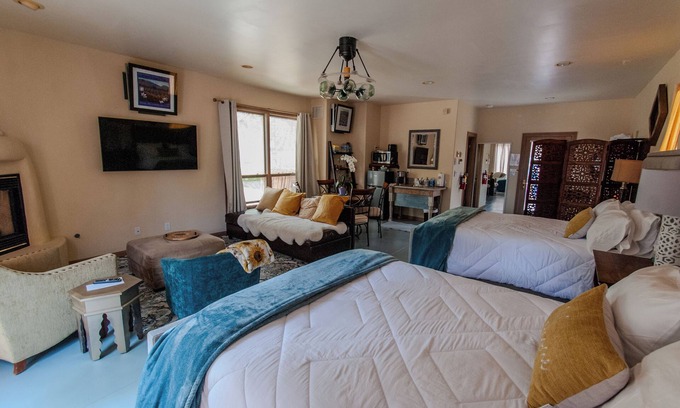Welcome to the Sunflower Casita at Santuario Grande, a charming retreat perfect for traveling companions or a small group of friends. This cozy casita accommodates up to four guests and features bright, sunflower-inspired decor that creates an inviting, homey atmosphere. With comfortable furnishings and thoughtful amenities, we ensure a relaxing stay.