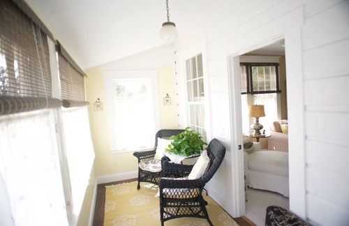 The sun room is at the front of the house, facing the ocean with wicker chairs to read, knit or watch the waves roll in.