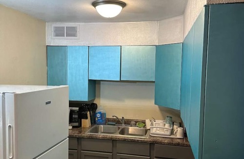 Apartment is one of four apartments in a fourplex. 1 bedroom 1 full bathroom, and kitchen. The bedroom has 1 queen bed and there is a bunk bed that is full size on bottom and twin size on top. The living room has 1 full size leather couch, 1 matching loveseat, and a sofa sleeper. The sofa sleeper converts into a full size bed. The living room TV is a 58” flatscreen Roku. Host has subscription to Netflix and Peacock, or you may use your own subscriptions for YouTube etc. Kitchen has all the basics you need oven, microwave, keurig, food ninja, spice rack, dining table for 3. The living room has lots of end tables, coffee table, and desk so it’s convenient to eat in living room or kitchen.