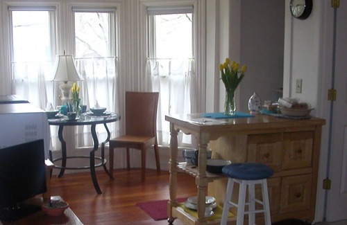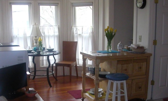 This sunny one-bedroom apartment on the second floor in a restored 1810 Federalist home has a full bath, living room with single sofa-bed/loveseat, two generous closets, sunny bedroom with a full-sized bed, and a food prep area equipped with servingware and appliances. The unit has new hardwood floors throughout. The space is bright, cheery, private, and comfy. Enjoy a beautiful apartment with cable access, and WiFi. An Air Conditioning unit is in the bedroom.