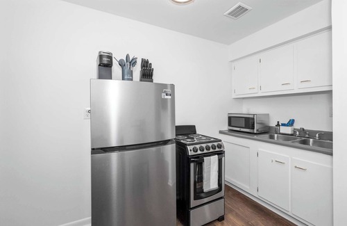 The home’s interior features bright and airy spaces accompanied by comfortable furnishings and minimalist décor. Rich wood flooring runs throughout each room, creating synergy and flow. Kick back and relax on the plush living room sofa while you stream a movie or binge episodes of your favorite show on the smart TV. Steps away, the well-equipped kitchen has everything you need for the added convenience of preparing quick and easy meals right at home along with storing all your snacks. The Keurig coffee maker will perk you up in the morning, and you can enjoy your fresh cup with a view of the neighborhood at the high-top dining table for 2 as you plan out another day’s adventure.