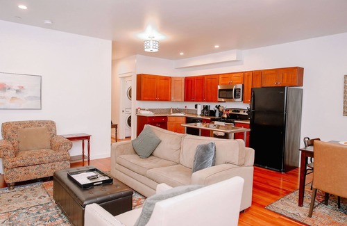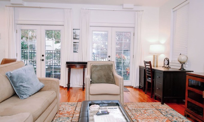 The kitchen is fully stocked with a stainless range for cooking, granite counters, and newer appliances including microwave and dishwasher. The living room features a queen sleeper sofa, flat screen TV with Roku, fireplace, and air conditioning for warmer days. The bedroom features a king bed, ceiling fan and large closet. The unit has hardwood floors and a laundry room with a washer and dryer. This wonderful newer condo style apartment has a quaint open floor plan with two French doors that lead out onto your own patio for outside dining and entertaining. If you are here on business there is wireless internet and a desk for your computer.