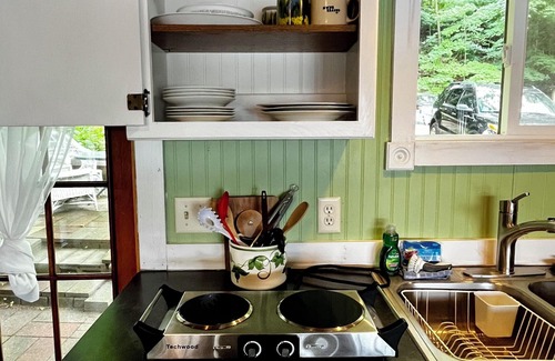 The kitchen comes fully stocked, allowing you to prepare all your meals on electric burners/hot plates with pots, pans, knives, utensils, and a coffee maker provided for your convenience.