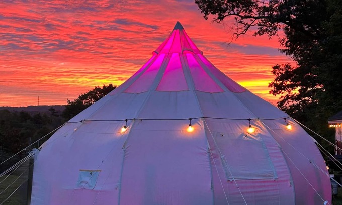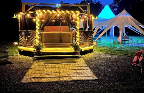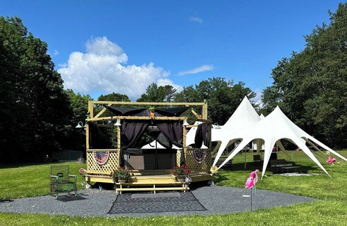 We are offering a 20' Stargazer bell tent for a romantic stay stargazing or just a special weekend with the family. Heat pump provides AC/Heat. 7-person Hot Tub on site. Free Wi-Fi, mini refrigerator, and outdoor propane grill. Porta Potty, showers are seasonal.