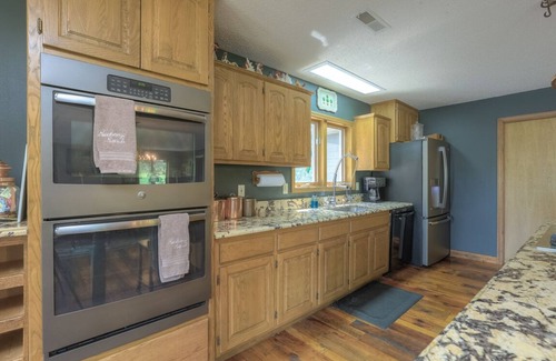 As our guests, you will enter your private resort through a 1/4 mile paved driveway. On a cooler evening, the fire pits will invite you to bask in its warmth. Our spacious kitchen is fully equipped for your convenience with everything from spices, cookbooks, utensils, electric griddle, cookware, bake ware, plate ware, and silverware you need to feed your extended family. Coffee, sugar, oil, and creamer are also provided for your convenience. And besides everyday plate ware, there are more formal serving plates and wine glasses for those special occasions.