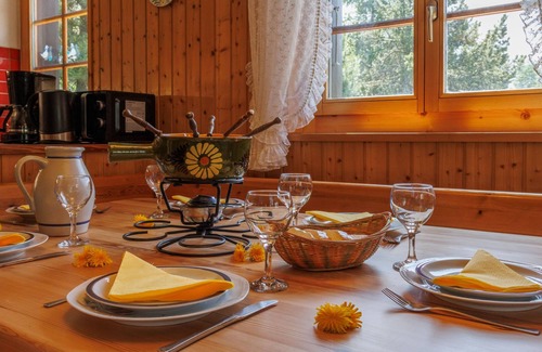 "Notre Rêve", 4-room chalet on 2 levels. Tasteful and cosy furnishings: living/dining room with Scandinavian wood stove, dining nook, satellite TV, flat screen and radio. Exit to the patio. Open kitchen (4 hot plates, oven, dishwasher, toaster, kettle, microwave, electric coffee machine, Capsules for coffee machine (Filter), raclette grill, fondue Set (chinoise, cheese)) with hatch. Sep. WC. Upper floor: 3 rooms, each room with 2 beds (90 cm, length 200 cm). Bath/shower/WC. Balcony, large patio. Terrace furniture. Marvellous view of the mountains, the ski run and the countryside. Facilities: washing machine. Internet (WiFi, extra). Parking at the house. Please note: non-smokers only.