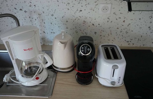 L'appartement est équipé d'une machine à laver ainsi que d'une cuisine toute équipée (plaques de cuisson, réfrigérateur-congélateur, cafetière, mini-four...). Le studio donne sur une terrasse avec un salon de jardin extérieur. Le jardin fait 200 m2.