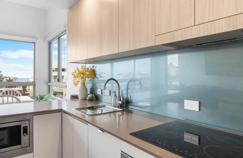 Open plan kitchen, dining and lounge space with large windows for loads of natural light. Sit at the dining room table or the 2nd balcony to soak in the beautiful Ocean views. The kitchen has ample storage and bench space, breakfast bar, plus a hidden internal laundry space.