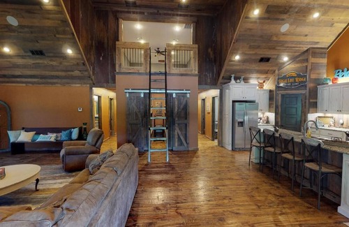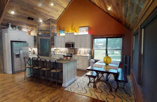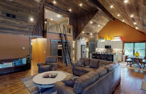 Our cabin come with a fully stocked kitchen. With stainless steel appliances, ice machine, Fridge, Oven, Dishwater; not to mention cookware, utensils, and serving ware for 24 guest! We also have additional items tucked away such as: Blender, Table Top Griddle, Chopper, Crockpot, ect). You will find this kitchen has plenty of natural light, as the windows across the front of the cabin, allows those inside access to the beautiful scenery. Highlife Ridge offers seating for 12; which includes a long industrial table to seat 6-8 guest and bar top with 4 bar stools. If you still don't have enough seating... If you find yourself needing additional seating, we have you covered, step outside and there you will find a large deck which offers additional seating for guest on either the outside furniture or additional chairs that can be moved inside!!!