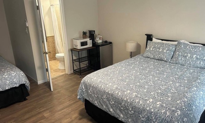 Discover this adorable retreat room in Barksdale. This hotel-style property features a cozy bedroom with a queen bed and a full bed, perfect for a small group of guests. Enjoy amenities like WiFi, 55" TV, Keurig coffee maker, microwave, mini fridge, heating, and AC. We think our place will help you experience everything Barksdale has to offer. Even an onsite coffee shop!