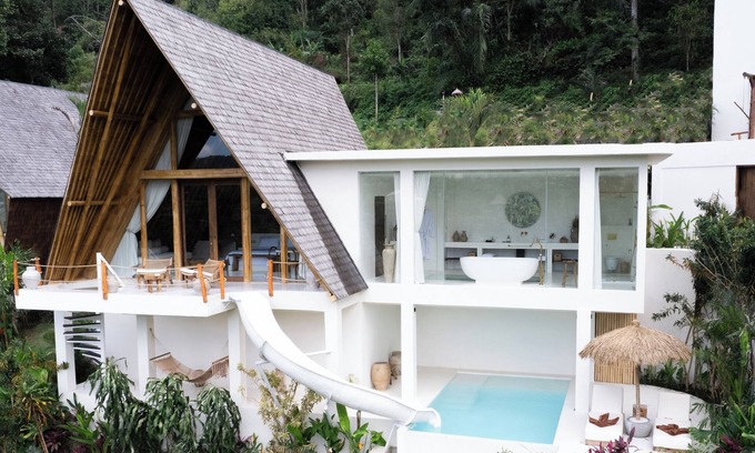 Villa Ayu features a private balcony to admire the volcano. Enjoy your pool's private slide and take a hot bath in your tub while admiring the rice terraces. Equipped with a minibar, safe, air conditioning, and luxurious bathroom. Located 1.5 hours from Ngurah Rai Airport and 2 hours from Seminyak. Enjoy a private pool, spa, trekking, fine dining, scooter, projector with Netflix/Disney+, and a jungleoutdoorgym.