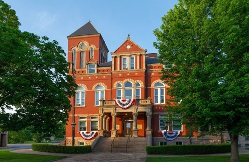 LIVING SPACE – Enjoy the abundant natural light streaming through the large windows that frame a stunning view of the picturesque Fayette County Courthouse. The comfortable living area has a sofa, lounge chair, table, lamps and smart TV. Dine at the kitchen bar or cozy low top table.
