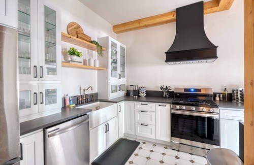 • Two kitchens with brand-new stainless steel appliances, quartz countertops, and essentials for cooking.