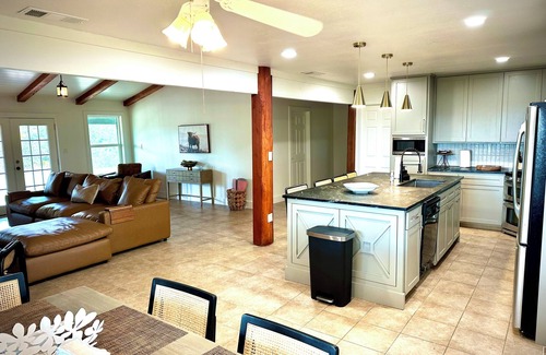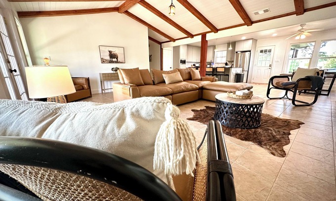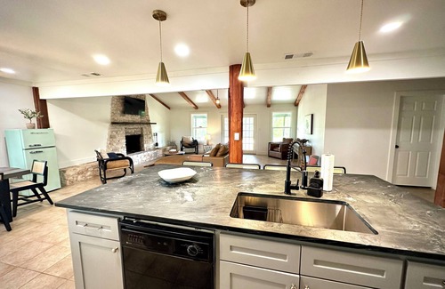 The Ranch in La Grange, TX is tucked away on a farm road off Hwy 71 giving quick and easy access to your route to Round Top for Antique Week. The sprawling, updated home features a central living, dining and cooking space with three bedrooms and two bathrooms for your large group. Great for reunions, gatherings and long weekends. Enjoy fishing in our stocked pond, relax on out back and sip your morning coffee with the sunrise. La Grange is a great location to converge from Houston, DFW, San Antonio or Austin.