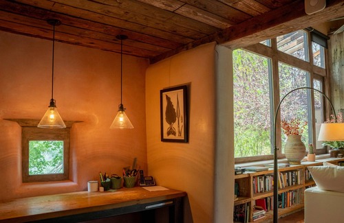 Hosting two living rooms (one fold-out couch), an 8-10 person dining room, one gorgeous guest bedroom (Hästens queen), an enormous master ( Hästens king) bedroom, 2 bathtubs, a binge-worthy library, 3 separate terrace spaces, an upstairs loft meditation area, a fountain and pond facing the Pedernal and lastly a small creek (acequia) that runs along with the home.