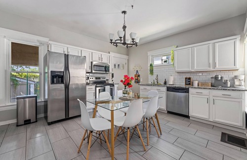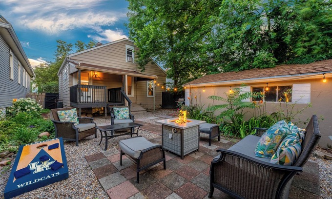 The accommodations feature four spacious bedrooms, each equipped with a Smart TV for your entertainment. The fully stocked kitchen comes complete with a Keurig coffee maker, essential amenities, and thoughtful touches like coffee, sugar, and creamer to kickstart your mornings. Gather in two large common areas adorned with Derby-themed props, a bar cart, and a record player that sets the mood for your celebration. Step outside to enjoy the large fenced backyard, perfect for outdoor ceremonies or casual get-togethers around the firepit, all under twinkling string lights. Additional conveniences include a washer and dryer, free Wi-Fi, and ample street parking right in front.