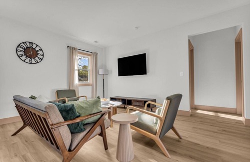 Unwind in the spacious living area with mid-century flair, stream your faves on the wall-mounted TV, or gather 'round the sleek dining nook for board games and takeout. The fully stocked kitchen? A vibe. Sage and slate cabinetry, black appliances, and butcher block counters come together like they were meant to be on a magazine cover.