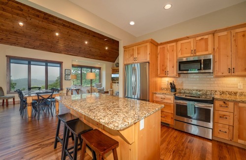 Welcome to Oak Cottage, a private, pet-friendly Sutton Knob custom home, with features your entire group will love! Begin your vacation the moment you start to drive up the mountain, and enjoy beautiful far reaching peak-a-boo vistas around every turn. Located only 10 minutes from the entrance to Pisgah National Forest, this high-end home has a gravel driveway with ample parking space and a garage. The main entrance of the home is accessible by 2 steps. The entryway opens into the great room with tongue-and-groove ceilings, big windows for tons of natural light and big mountain views, a wood-burning fireplace, plenty of comfortable seating, a TV, and unique rustic touches. A half bath is located just off the entryway. The dining area is off the living room and has a table with spaces for 6. The thoughtfully equipped kitchen is complete with stainless steel appliances, a standard coffee pot, a Keurig, and all the dishes, pots, and pans guests will need to create meals for their group.