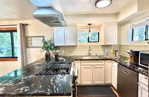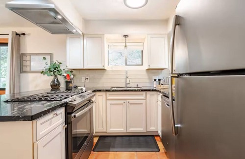 Coffee enthusiasts can choose between a Keurig (pods provided) machine or a French press with a manual coffee grinder. Enjoy your drinks and meals in charming areas like the dining table overlooking the trees, or on the patio itself under the trees.
