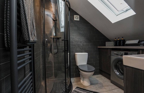Modern shower, toilet, basin, touch light mirror, hand soap, shampoo, conditioner, towels, hand towels, storage space and washing machine tucked away for your convenience.
