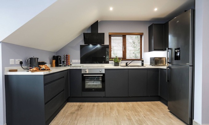 Our Lodge offers a bright, open-plan studio-style layout, perfect for all stays, relaxation, working from the lodge, or simply seeking those cosy winter nights in!