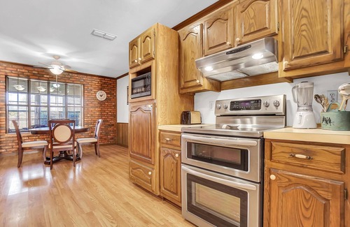 Welcome to Oaklawn Retreat in Vernon, Texas! This charming 4-bedroom, 2.5-bath home offers 3 king beds, 1 queen bed, and a sleeper sofa, perfect for families or groups. Enjoy the enclosed patio for morning coffee, a fenced yard for outdoor fun, and a cozy fireplace for relaxing evenings. With a washer/dryer, 2-car garage, and all the modern comforts, this home is ideal for a peaceful getaway. Conveniently located near local attractions, Oaklawn Retreat is your perfect spot to unwind and explore.