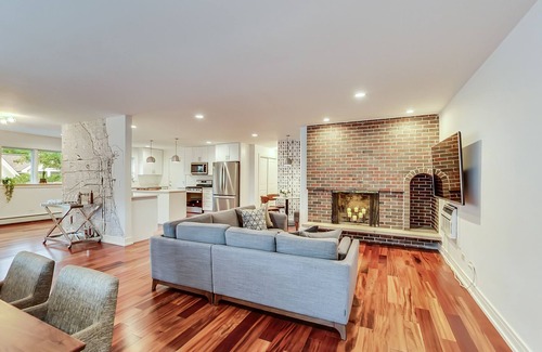 Stunning Design and Entertainment Space: As you walk in, you're greeted by an eye-catching downtown Chicago mural and a stylish bar, setting the tone for your stay. The living and dining areas are tastefully adorned in the timeless elegance of Mid-Century Modern, complemented by a decorative fireplace with mood-setting candles. This open floor plan is designed for entertaining (no parties), whether you're celebrating or simply enjoying quality time with your loved ones.