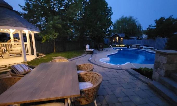 Enjoy a private oasis just 5 minutes from downtown Kingston! The backyard features an inground pool (closed until spring 2025), lounge chairs, a gazebo with nesting chairs, and a stone patio dining area. Perfect for relaxing, playing, or yoga by the pool. The property boasts mature maple trees and country gardens along a stone path.