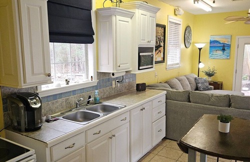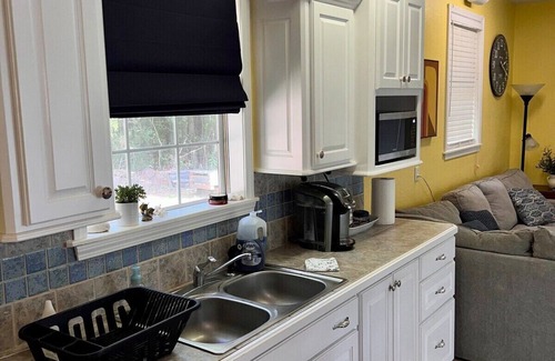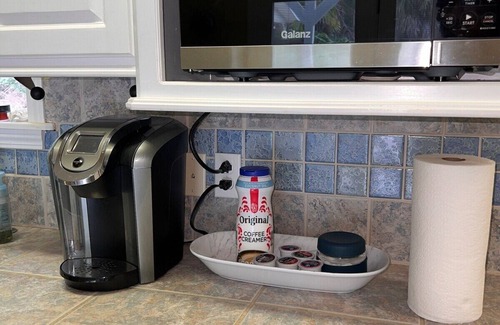 Kitchen:Fully equipped with a stove, refrigerator, microwave, coffee maker, and essential utensils and starter kitchen supplies, including K-cups.