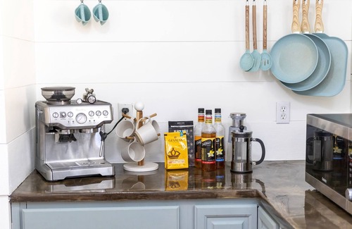 ☀ Full kitchen with gas stove, coffee bar, and kitchen island