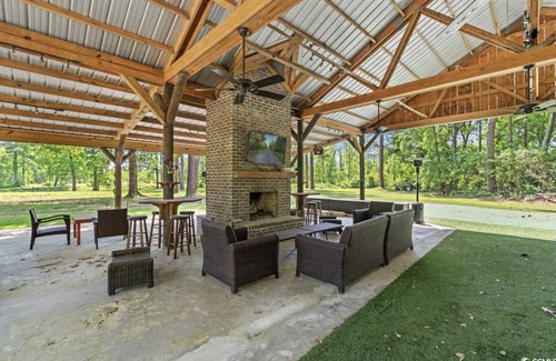 Party barn includes dual sided fireplace, tv, swings, outdoor furniture, and even a disco ball. There is a putting green with chipping area, horseshoe pits and corn hole boards.