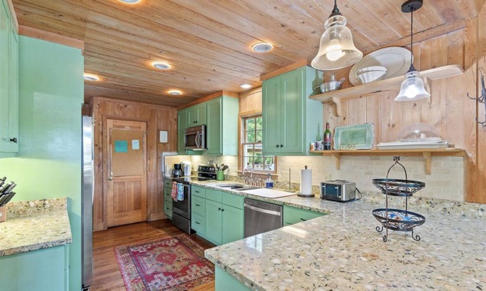 Kitchen comes well stocked with supplies for all of your cooking needs. As well as the long dining room table that seats up to 14 that is great for families to gather around.