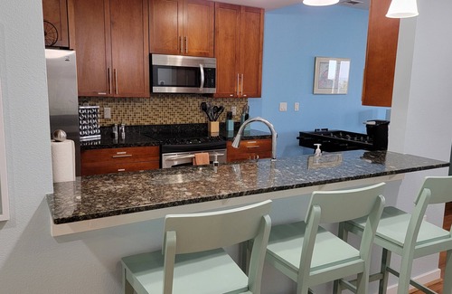Enjoy homemade meals in the large, fully-equipped gourmet kitchen with granite countertops, stainless steel appliances, and a bar top with bar stools. Relax on the private patio with both Ocean and Bay views! Cuddle up for a movie night on the large 70" Samsung 4k Smart TV with 5.1 surround sound or have a family game night.