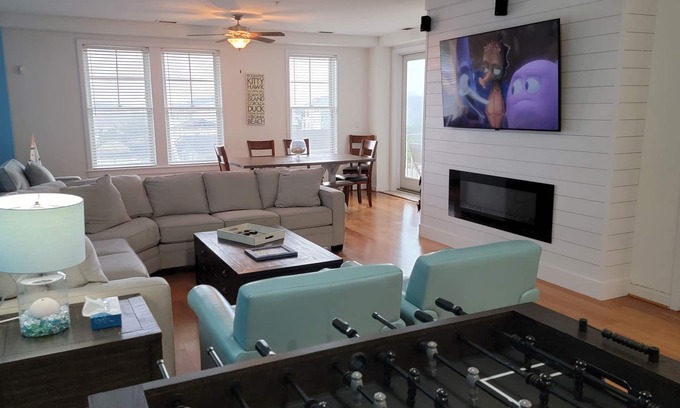 Inside, you'll find a spacious living area that features a stunning shiplap fireplace feature wall, premium hardwood floors throughout, two comfortable over-sized sitting chairs, a large, comfy sectional with queen sleeper, a foosball table, and dining for 8. You'll also find Ocean views from some areas in the main living space.
