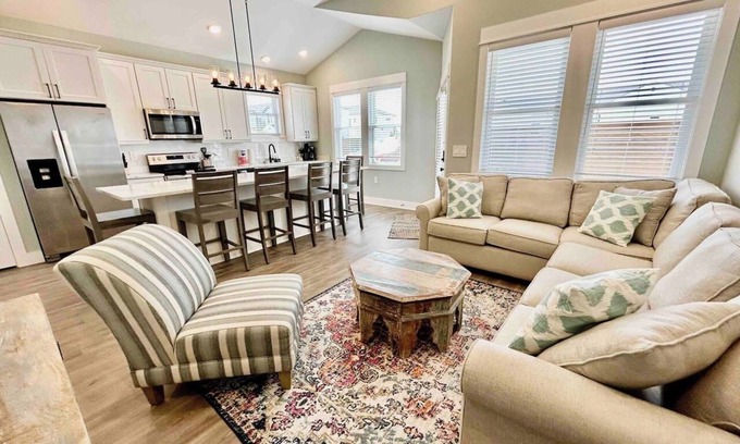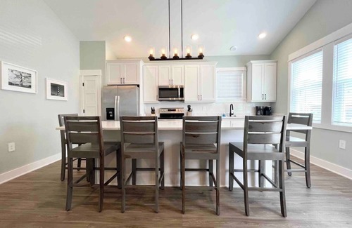 The open concept kitchen boasts a 10 foot counter with enough seating for your group to gather, prepare meals, play games and make memories.