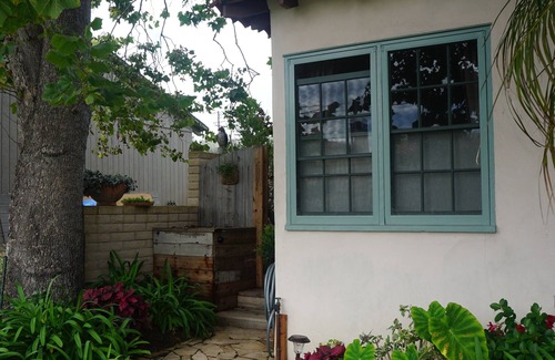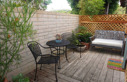 Located in a quiet coastal neighborhood, this lovely Suite is in a completely private wing of a larger home. Stroll along Edgewater to the beach in only 5 minutes or along the bluffs for beautiful sunsets. Walk up 3 steps to your private deck and entry area where you will find comfortable outdoor seating. Here you can enter to see your room. There is a queen size bed. The TV is inside of the armoire in the bedroom. The newly updated bathroom includes a separate bath and shower. In addition you will find a Keurig coffee maker and pods, a microwave oven, as well as a refrigerator. There is not a full KITCHEN. Lovely gardens surround this quiet retreat. There are many local amenities within blocks and downtown Santa Barbara is only a 5 minute drive.