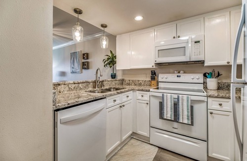 - Modern Amenities: Newly remodeled in August 2016, this property boasts granite countertops, custom-tiled walk-in showers, and in-unit laundry facilities for all your convenience during your stay.