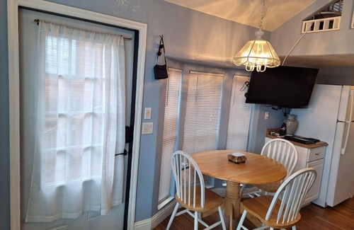 The main living area features bay windows, bamboo hardwood floors, and vaulted ceilings. The fully-equipped kitchen includes a full refrigerator, dishwasher, electric oven/range, microwave, standard coffee maker, and Keurig coffee maker.