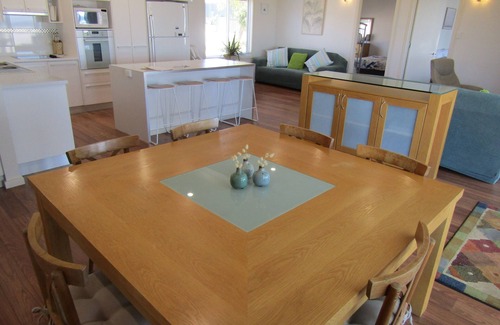 Open plan kitchen, kitchen island with stools, dishwasher, large fridge/freezer, electric stove top and oven, microwave, pura tap, Nespresso coffee machine (BYO pods), toaster, kettle, air fryer, bread maker, sandwich press, rice cooker. Dining with large table and chairs, seating area by kitchen with lounge and single chair, split system reverse cycle air-conditioner, living area with large smart TV, lounge, single chair, coffee table and porta cot.