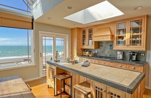 Ocean Front - Ocean Fall is a newly remodeled spacious two bedroom, two bathroom home on stunning Cliff avenue. A king bed in the downstairs master bedroom and a queen bed in the upstairs bedroom. The home sits on the bluff above Wrights beach, and has beautiful panoramic views of the pacific ocean. A large deck with outdoor furniture, and a hot tub overlooking the beach! Large flat screen TV, with YouTube TV service, and fast free WiFi service provided by Starlink.