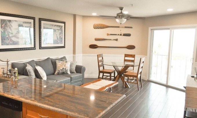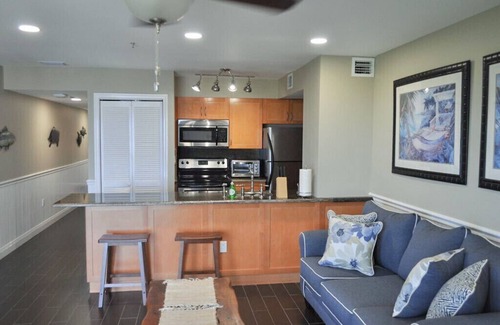 Situated in the most coveted building, Building 5, fondly known as "Swordfish," our apartment features an impeccably appointed bedroom with a queen-sized bed. Revel in the mesmerizing views from the living room balcony, overlooking the picturesque marina and ocean. The fully equipped kitchen, complemented by countertop seating, ensures effortless meal preparation, while the in-unit washer/dryer adds convenience to your stay.