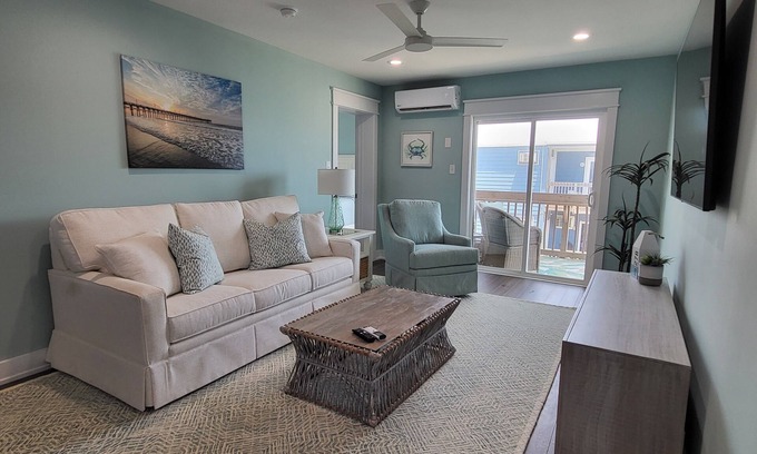 This is noy your average beach condo! Every inch has been gutted and renovated. 2 bedrooms with plush mattresses. All new appliances which also includes a washer and dryer. Bathrooms have newly tiled showers. Bamboo flooring thru out. Queen sleeper sofa in the living room. Smart TV's in both bedrooms and the living room. Sit on the balcony and watch the dolphins play in the surf or spend your afternoon searching the beach for sharks teeth!