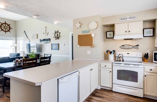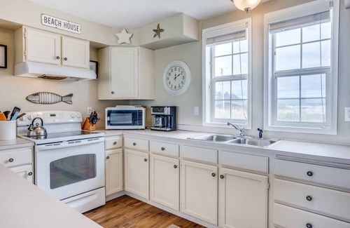 The brightly lit living area is open to the kitchen and dining room and is great for friends and family to enjoy time together and to watch the Pacific Ocean and the ever-changing sand dunes. A Shore Thing's wall of west facing windows will fill the space with light, and with its nautical and beachy decor, is guaranteed to add cheer to even the stormiest coast days. A cozy electric fireplace adds to the enjoyment of the room. Stream your favorite movie or show on the large flat screen TV in the living room after a busy day exploring the beach. Prepare your favorite feast and sit at the dining table which is perfect for family time meals, visiting, and playing board games or puzzles. A Shore Thing has a Primary bedroom with a king bed and fabulous ocean views that you can curl up in bed and enjoy! The second bedroom has a queen bed and a built in twin bunk bed. The living room also has a sleeper sofa for an additional sleeping option. One full bath is located between the two bedrooms with the second bath located off of the great room. The ocean facing deck is the perfect spot to enjoy on a sunny day where you can grill up an amazing catch of the day or sip on a favorite drink while you watch the sun sink into the Pacific.