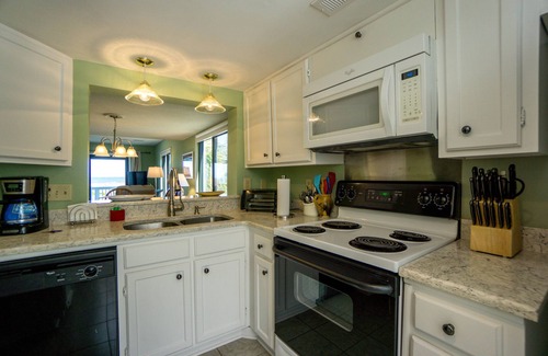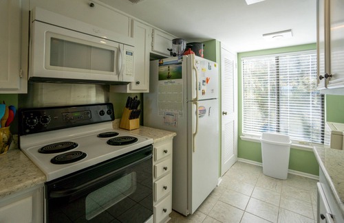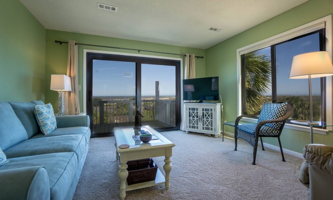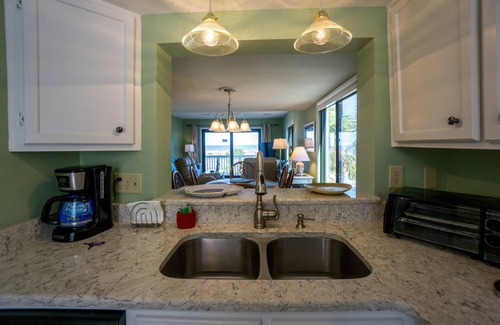 This coveted front row end unit is pleasantly decorated in soft blues and greens that compliment the palmetto trees outside the large side view windows. The morning sun and the afternoon shade afford the guests perfect timing for prime use of the open deck from the living room. This condominium has a powder room on the first living, dining, and well equipped kitchen floor and the two bedroom and two bathrooms are on the second floor. The master bedroom has a king bed and the second bedroom has a twin and a double bed.